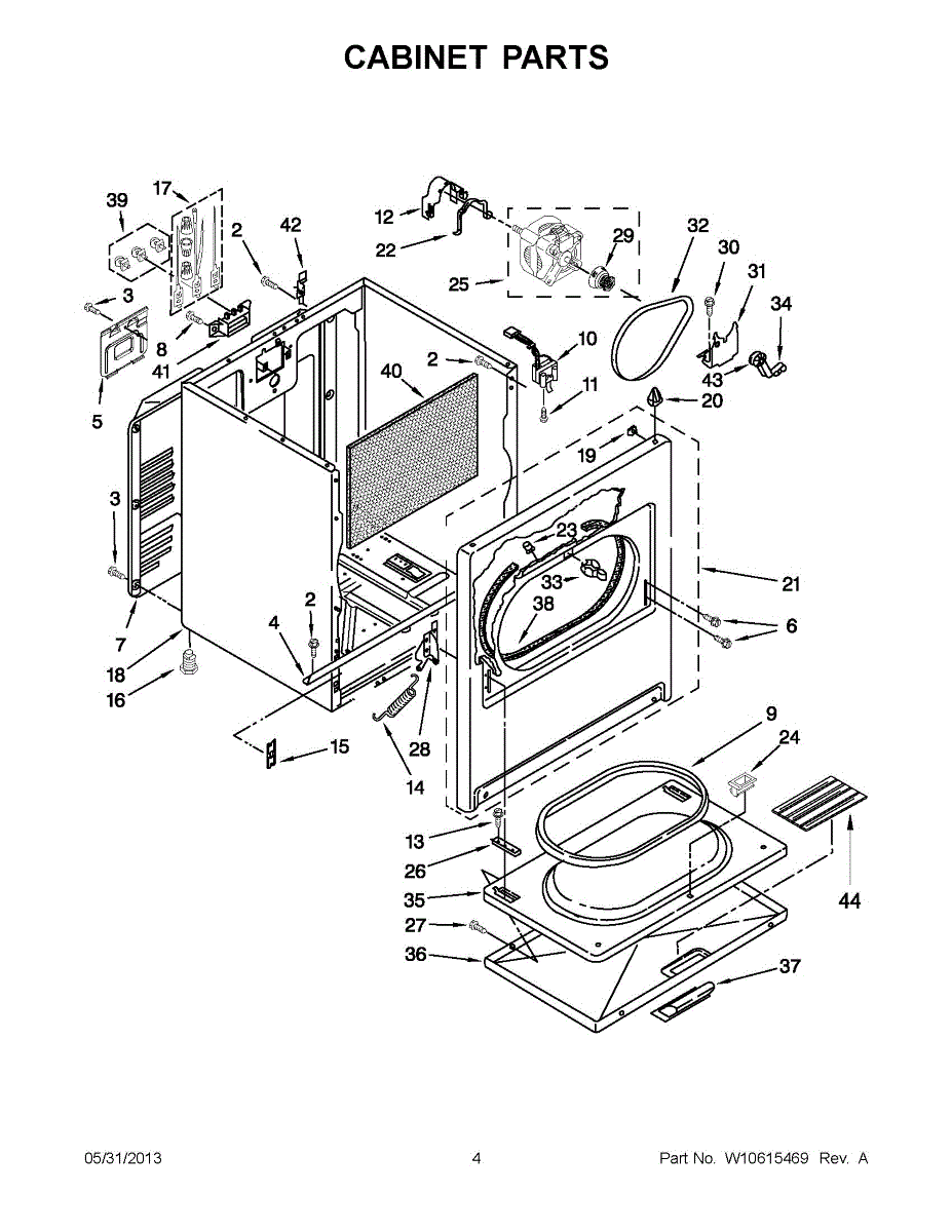 Dryer outer cabinet that houses internal components. Replace if your cabinet is rusted, dented, cracked, or damaged, compromising structural integrity.