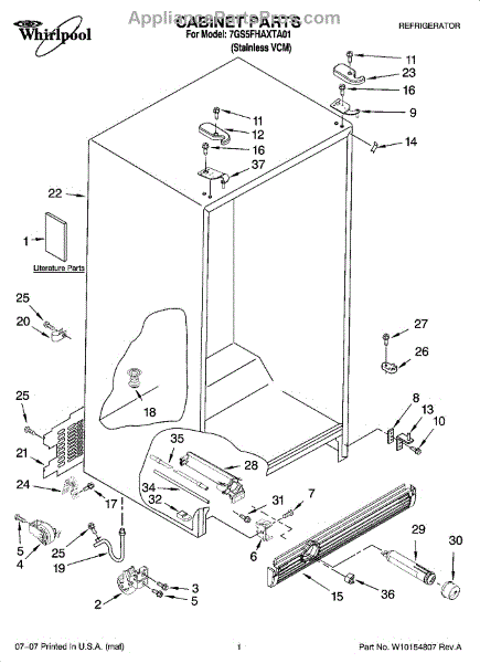 A factory fastener used to secure appliance components and panels. Replacing a missing, rusted, or stripped screw restores a solid, rattle-free fit and helps keep brackets, housings, and covers properly aligned for reliable operation.