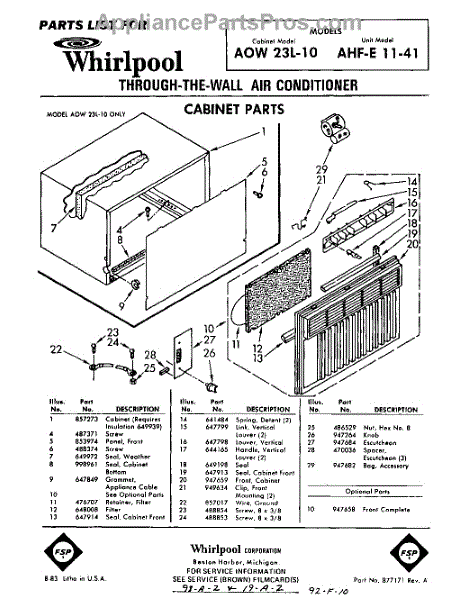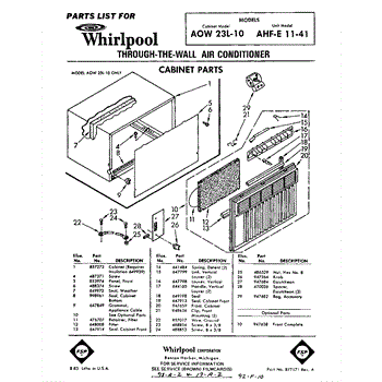 Parts for Whirlpool AHFE1141: 01 - Cabinet Parts