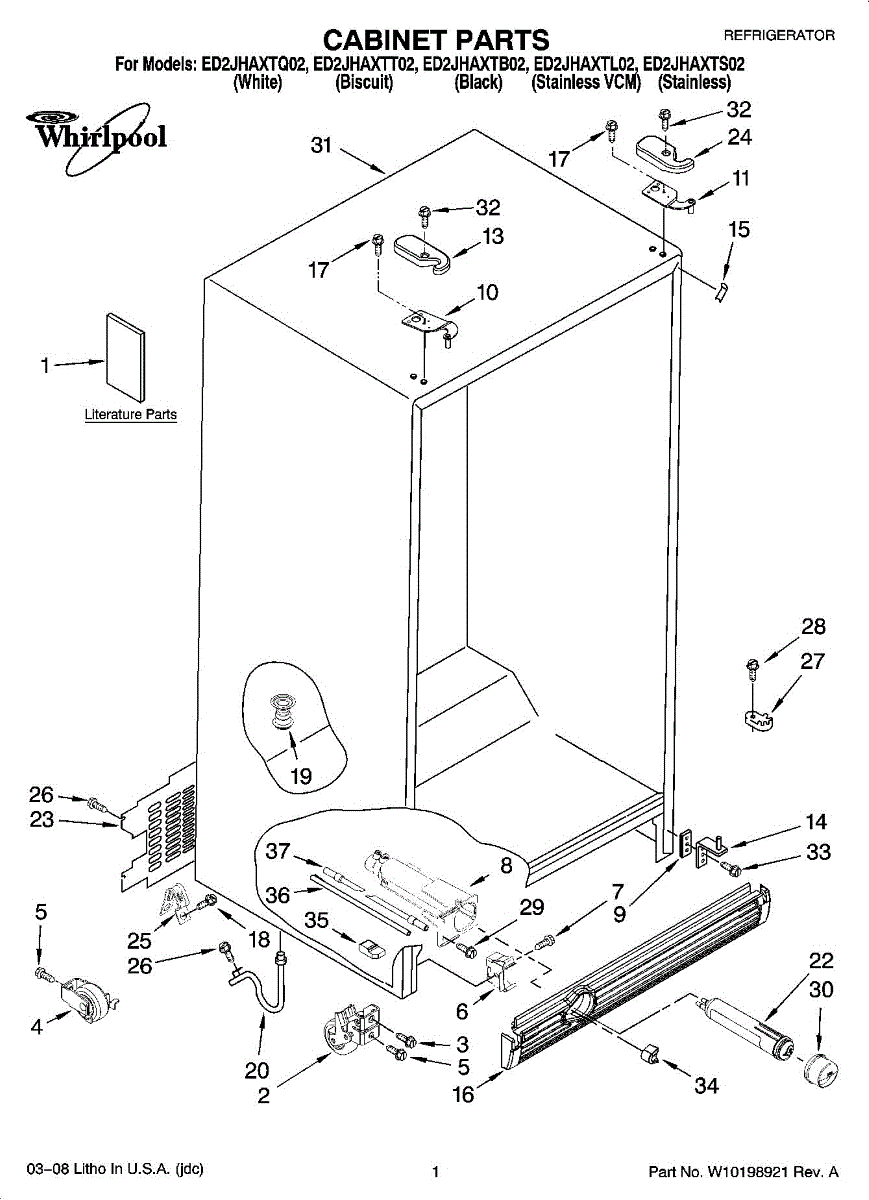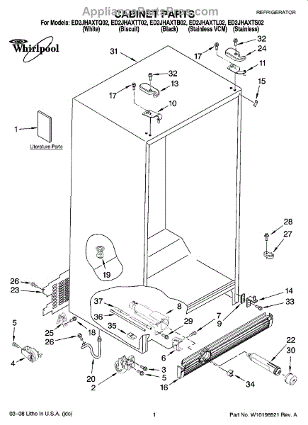 Biscuit-colored hinge cover for side-by-side refrigerators. Snaps onto door hinge to conceal hardware. Replace when cracked, discolored, or missing.