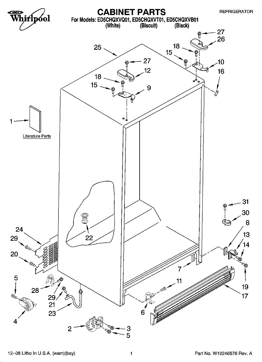 Biscuit-colored hinge cover for side-by-side refrigerators. Snaps onto door hinge to conceal hardware. Replace when cracked, discolored, or missing.