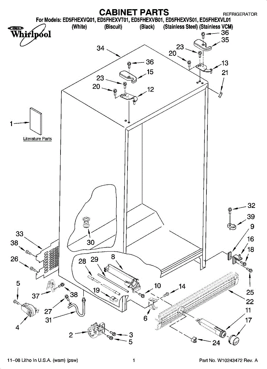 Biscuit-colored hinge cover for side-by-side refrigerators. Snaps onto door hinge to conceal hardware. Replace when cracked, discolored, or missing.