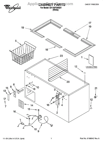 The Basket is an OEM part for Whirlpool chest freezers. It is the removable storage compartment found inside the freezer where items can be organized and stored. The basket is designed with ventilation to allow for air circulation around stored items to maintain optimal freezing temperatures.