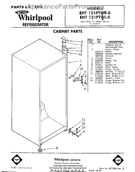 Parts for Whirlpool EHT121PTWR0: 01 - Cabinet Parts
