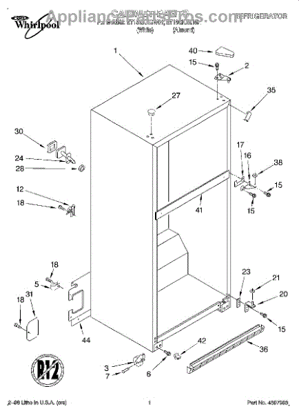 The Hinge Washer is an OEM replacement part for Whirlpool refrigerators. This small washer plays a supports the refrigerator door hinge assembly. Center hinge plastic washer. Causes of a bad hinge washer are generally normal wear and tear from extensive use. As the washer absorbs pressure each time the door is opened or closed, it can gradually deteriorate or crack. Physical damage is also possible if the door is accidentally struck or slammed. Symptoms of a worn or damaged hinge washer include: