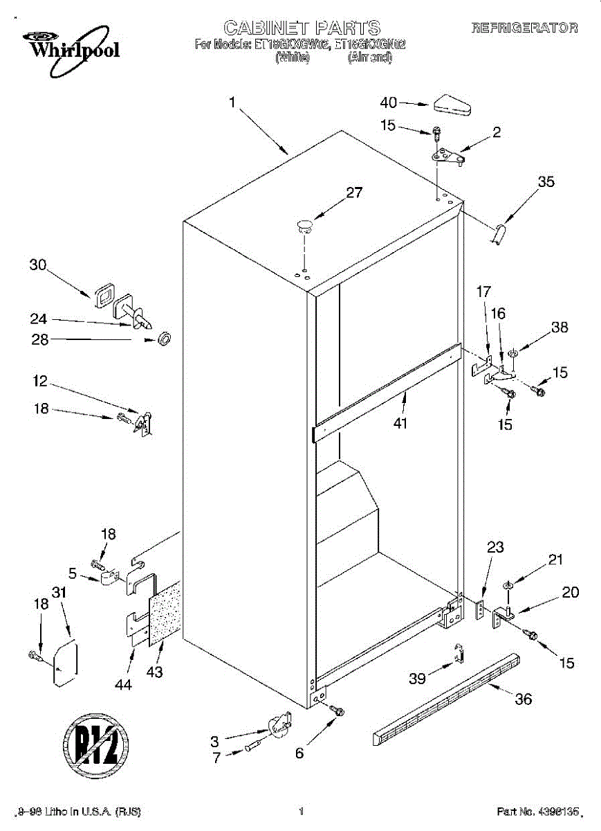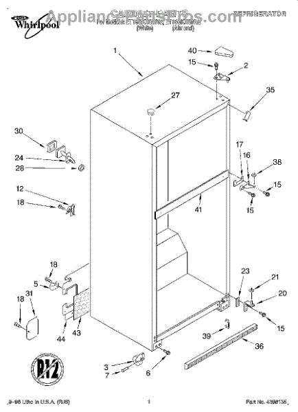 The Hinge Washer is an OEM replacement part for Whirlpool refrigerators. This small washer plays a supports the refrigerator door hinge assembly. Center hinge plastic washer. Causes of a bad hinge washer are generally normal wear and tear from extensive use. As the washer absorbs pressure each time the door is opened or closed, it can gradually deteriorate or crack. Physical damage is also possible if the door is accidentally struck or slammed. Symptoms of a worn or damaged hinge washer include: