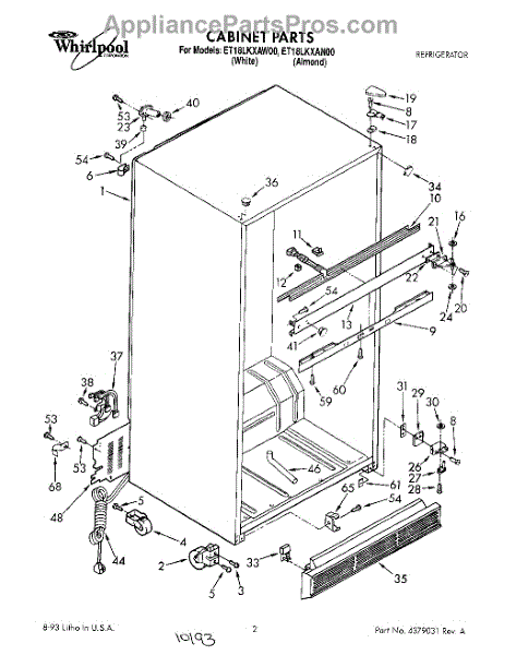 The Hinge Washer is an OEM replacement part for Whirlpool refrigerators. This small washer plays a supports the refrigerator door hinge assembly. Center hinge plastic washer. Causes of a bad hinge washer are generally normal wear and tear from extensive use. As the washer absorbs pressure each time the door is opened or closed, it can gradually deteriorate or crack. Physical damage is also possible if the door is accidentally struck or slammed. Symptoms of a worn or damaged hinge washer include: