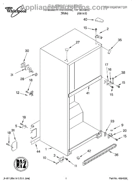The Hinge Washer is an OEM replacement part for Whirlpool refrigerators. This small washer plays a supports the refrigerator door hinge assembly. Center hinge plastic washer. Causes of a bad hinge washer are generally normal wear and tear from extensive use. As the washer absorbs pressure each time the door is opened or closed, it can gradually deteriorate or crack. Physical damage is also possible if the door is accidentally struck or slammed. Symptoms of a worn or damaged hinge washer include: