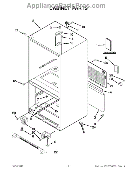 The Leveling Leg is an OEM replacement part for Whirlpool refrigerators. It is one of four legs situated internally at the base corners for proper tilt positioning. It raises or lowers each leg independently to stabilize units on uneven kitchen floors. Causes of replacement consist of wear from continual torque required during positioning processes. Thread damage or corrosion buildup attributable to floor locations over extended use necessitates periodic renewal as well. Symptoms involve: