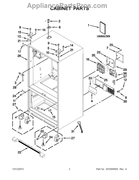 The Leveling Leg is an OEM replacement part for Whirlpool refrigerators. It is one of four legs situated internally at the base corners for proper tilt positioning. It raises or lowers each leg independently to stabilize units on uneven kitchen floors. Causes of replacement consist of wear from continual torque required during positioning processes. Thread damage or corrosion buildup attributable to floor locations over extended use necessitates periodic renewal as well. Symptoms involve: