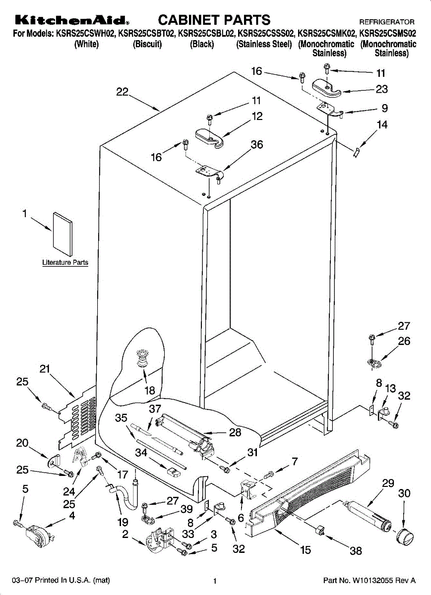 Door hinge for side-by-side refrigerators. Secures and pivots the door for proper opening and closing. Replace if cracked, bent, or worn.