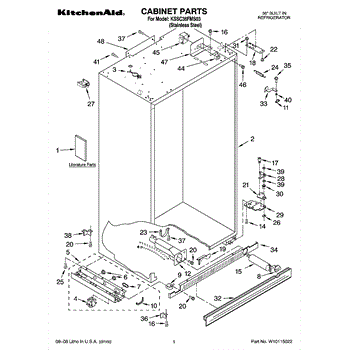 Support base bracket for side-by-side refrigerators. Mounts on the front left side to provide structural support. Replace if cracked or broken.