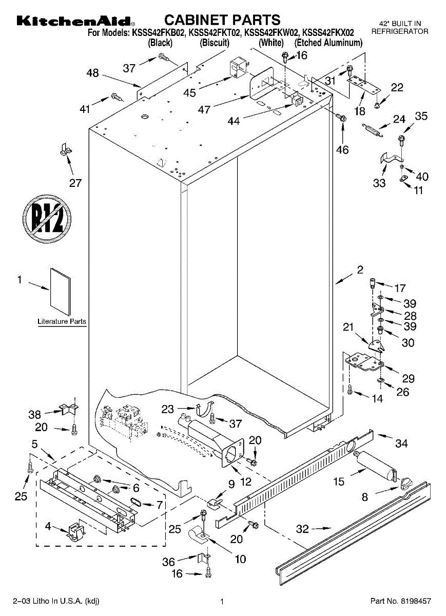 Support base bracket for side-by-side refrigerators. Mounts on the front left side to provide structural support. Replace if cracked or broken.