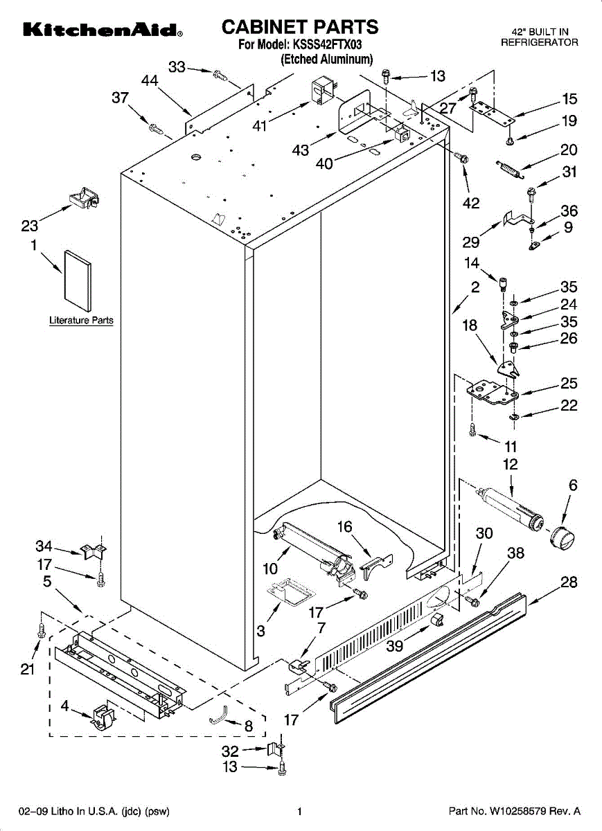 Support base bracket for side-by-side refrigerators. Mounts on the front left side to provide structural support. Replace if cracked or broken.