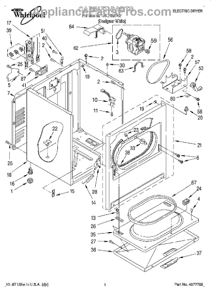 Fits all Whirlpool-made dryers (Whirlpool, Kenmore with prefix 110, Roper, KitchenAid, and Estate). Matching belt 341241 and rear support rollers 349241T. Whirlpool dryer repair manual 677818L.