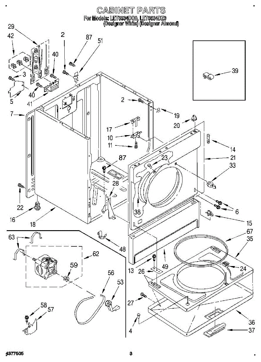 Fits all Whirlpool-made dryers (Whirlpool, Kenmore with prefix 110, Roper, KitchenAid, and Estate). Matching belt 341241 and rear support rollers 349241T. Whirlpool dryer repair manual 677818L.