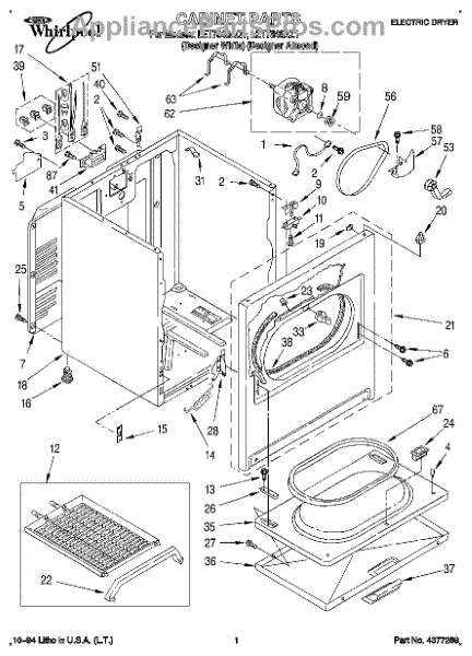Fits all Whirlpool-made dryers (Whirlpool, Kenmore with prefix 110, Roper, KitchenAid, and Estate). Matching belt 341241 and rear support rollers 349241T. Whirlpool dryer repair manual 677818L.