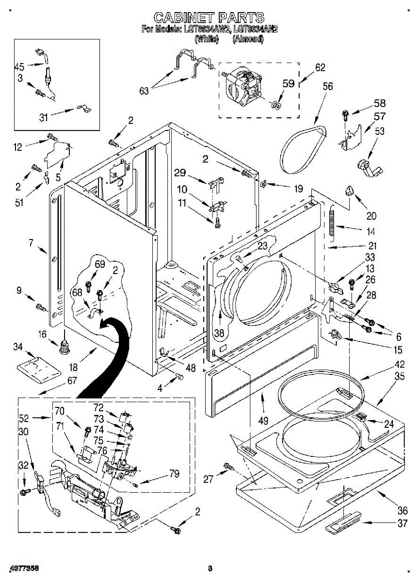 Fits all Whirlpool-made dryers (Whirlpool, Kenmore with prefix 110, Roper, KitchenAid, and Estate). Matching belt 341241 and rear support rollers 349241T. Whirlpool dryer repair manual 677818L.