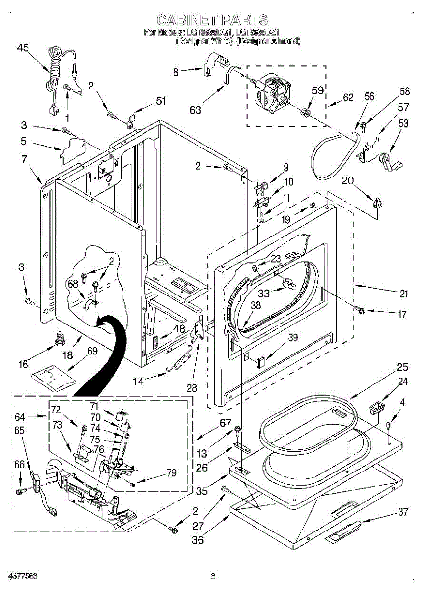 Fits all Whirlpool-made dryers (Whirlpool, Kenmore with prefix 110, Roper, KitchenAid, and Estate). Matching belt 341241 and rear support rollers 349241T. Whirlpool dryer repair manual 677818L.