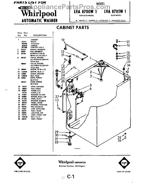Parts for Whirlpool LVA8705W1: 01 - Cabinet Parts