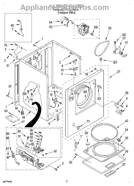 Fits all Whirlpool-made dryers (Whirlpool, Kenmore with prefix 110, Roper, KitchenAid, and Estate). Matching belt 341241 and rear support rollers 349241T. Whirlpool dryer repair manual 677818L.