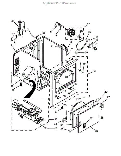Causes of a bad door catch can include wear and tear of the plastic tang and spring from years of repeated opening and closing of the dryer door. Over time, this limits its ability to fully engage and latch securely.