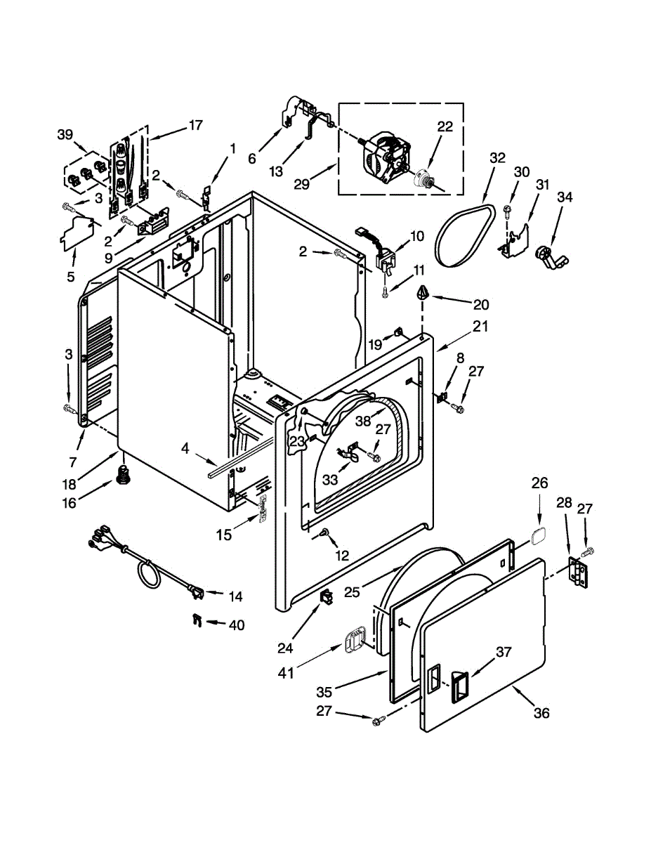 Fits all Whirlpool-made dryers (Whirlpool, Kenmore with prefix 110, Roper, KitchenAid, and Estate). Matching belt 341241 and rear support rollers 349241T. Whirlpool dryer repair manual 677818L.