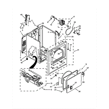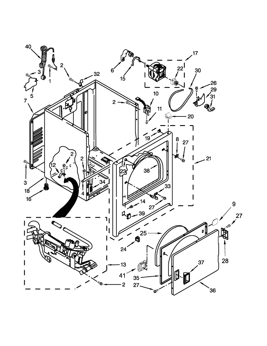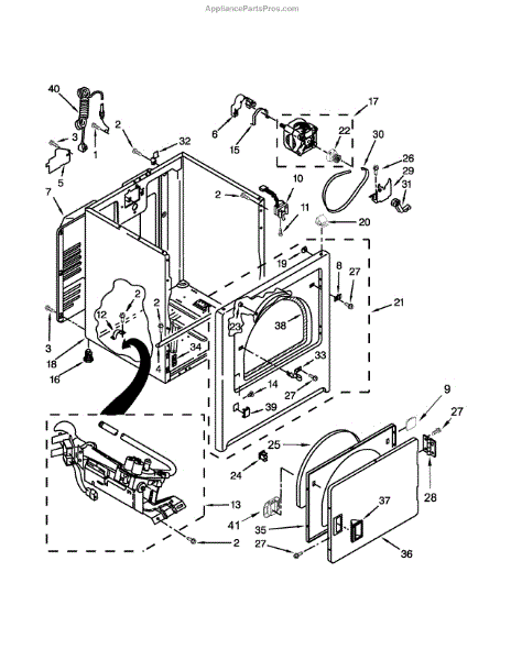 Dryer outer cabinet that houses internal components. Replace if your cabinet is rusted, dented, cracked, or damaged, compromising structural integrity.