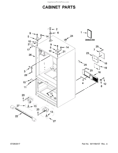 The Kickplate Grille is an OEM part for Whirlpool refrigerators. It is installed at the base of the refrigerator and serves to cover and protect the lower ventilation area, helping to ensure proper airflow to the condenser and other components. It measures approximately 37 inches wide, 2 inches high, and 4 inches deep.