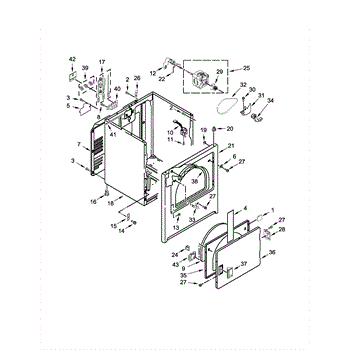 Dryer outer cabinet that houses internal components. Replace if your cabinet is rusted, dented, cracked, or damaged, compromising structural integrity.