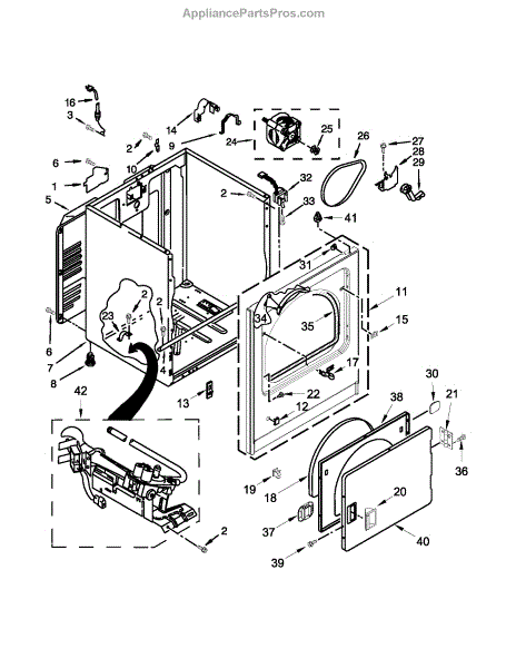 Causes of a bad door catch can include wear and tear of the plastic tang and spring from years of repeated opening and closing of the dryer door. Over time, this limits its ability to fully engage and latch securely.