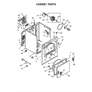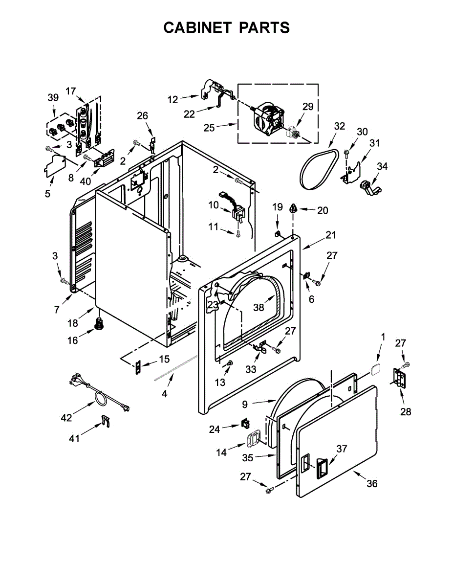 Dryer outer cabinet that houses internal components. Replace if your cabinet is rusted, dented, cracked, or damaged, compromising structural integrity.
