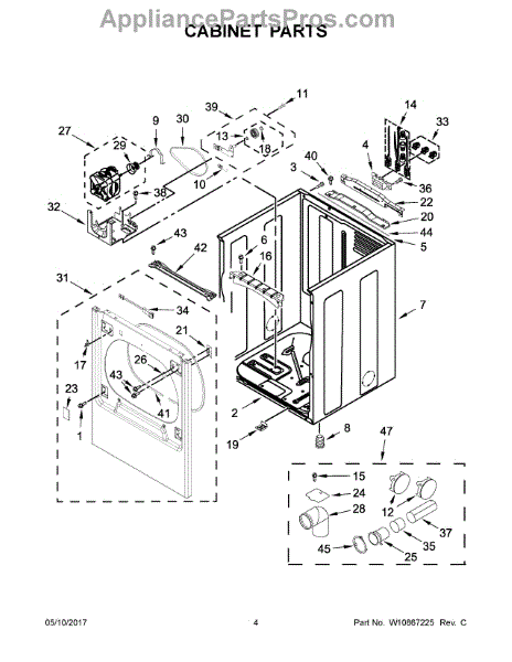 This exhaust pipe vents hot, moist air from the dryer to the home venting system, helping the appliance dry clothes efficiently and reduce indoor humidity. Replace a damaged or restricted pipe to restore proper airflow. What it does: