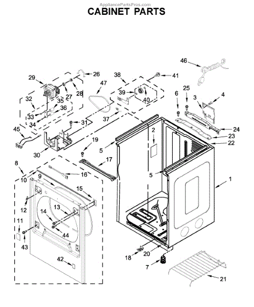 This lower cabinet base replaces a worn or damaged support panel that stabilizes the appliance and houses lower components. Restoring the base improves cabinet alignment and helps prevent vibration and under-cabinet damage. What it does: