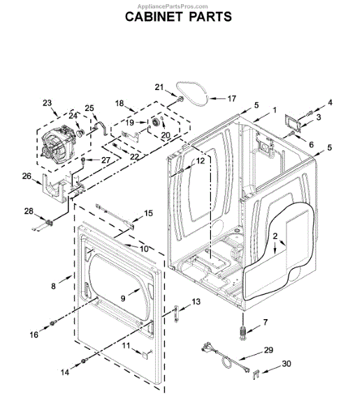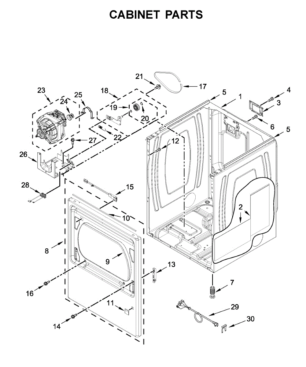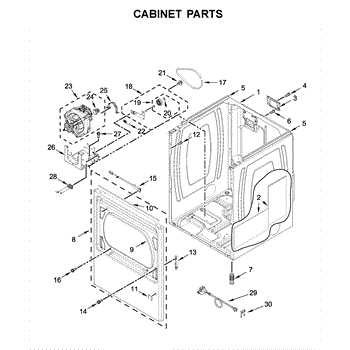 Cabinet housing for dryers. This outer shell encases internal components. Replace if cracked, rusted, dented, or structurally damaged from impact or wear.
