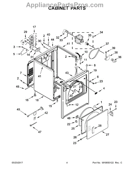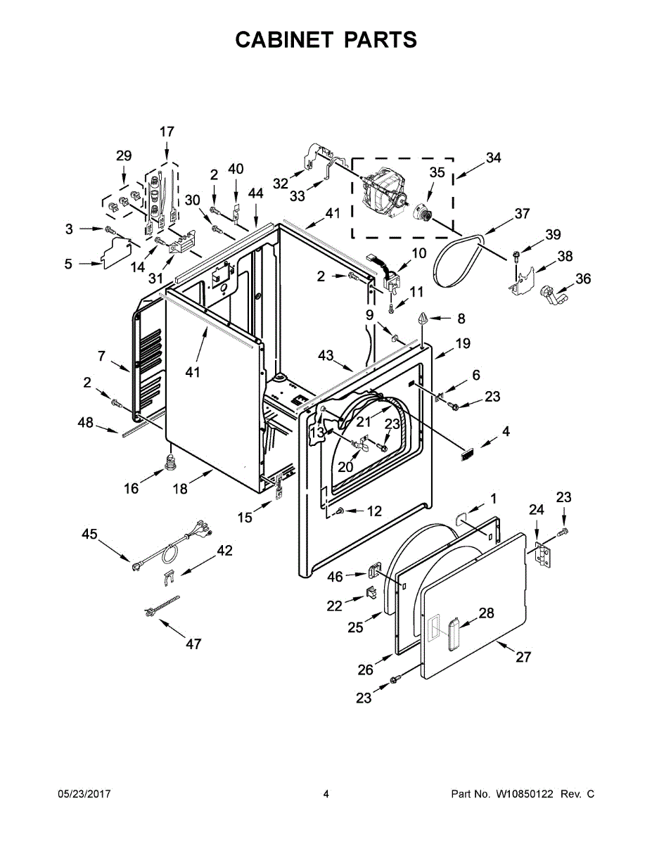 Dryer outer cabinet that houses internal components. Replace if your cabinet is rusted, dented, cracked, or damaged, compromising structural integrity.