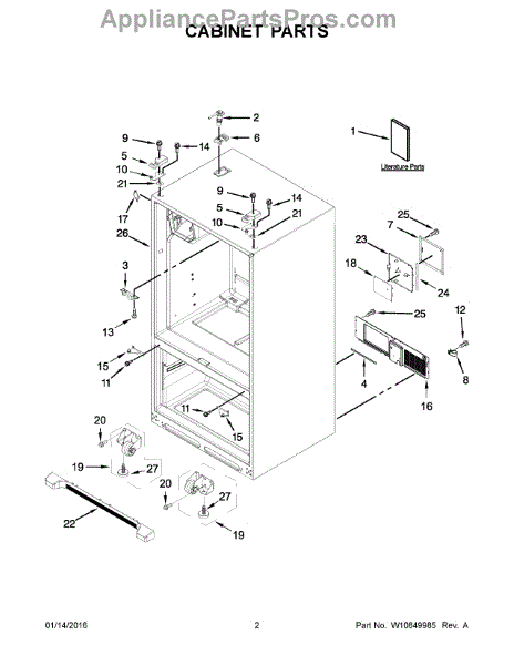 The Leveling Leg is an OEM replacement part for Whirlpool refrigerators. It is one of four legs situated internally at the base corners for proper tilt positioning. It raises or lowers each leg independently to stabilize units on uneven kitchen floors. Causes of replacement consist of wear from continual torque required during positioning processes. Thread damage or corrosion buildup attributable to floor locations over extended use necessitates periodic renewal as well. Symptoms involve: