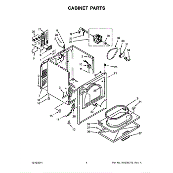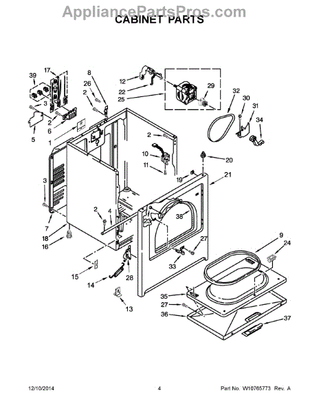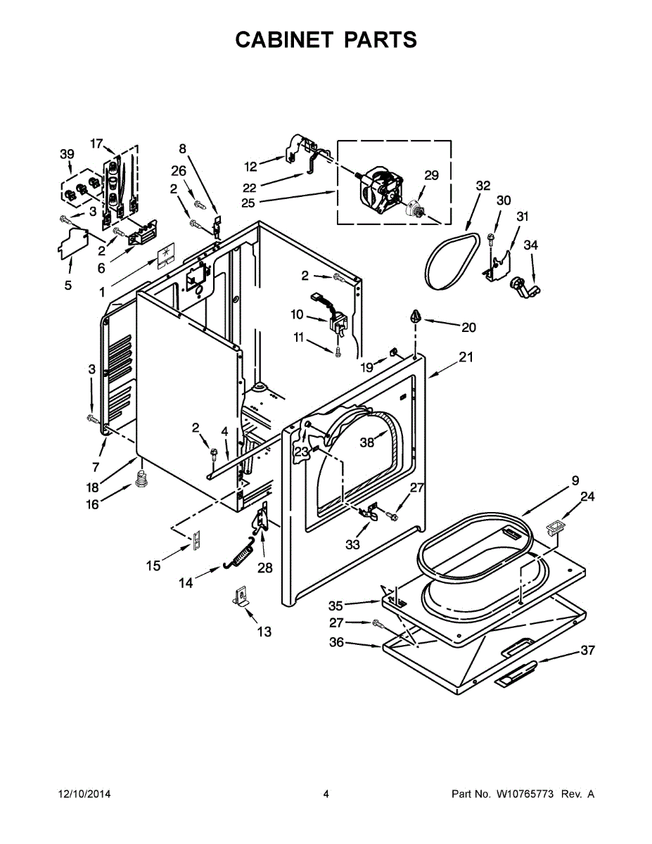 Dryer outer cabinet that houses internal components. Replace if your cabinet is rusted, dented, cracked, or damaged, compromising structural integrity.