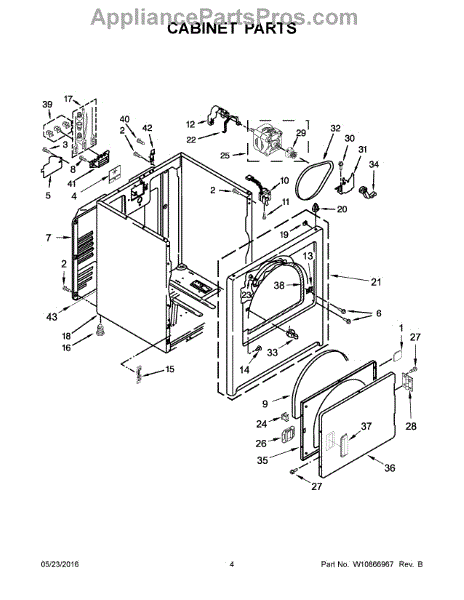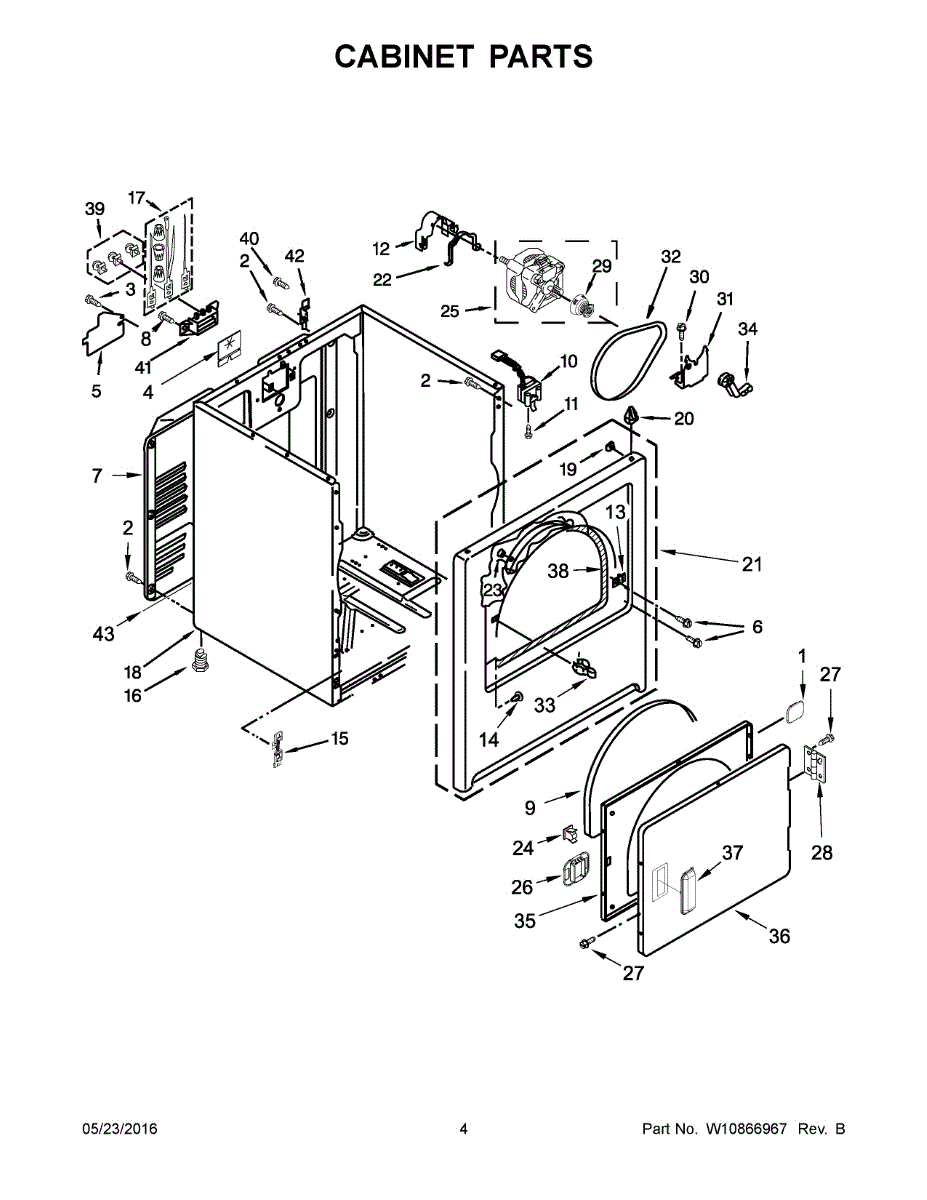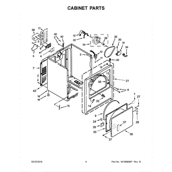 Dryer outer cabinet that houses internal components. Replace if your cabinet is rusted, dented, cracked, or damaged, compromising structural integrity.