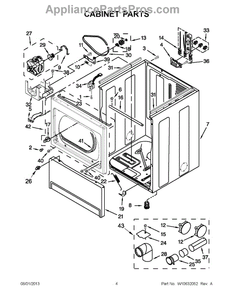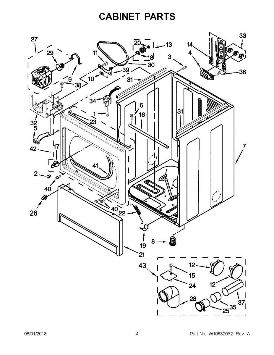 Cabinet housing for dryers. This outer shell encases internal components. Replace if cracked, rusted, dented, or structurally damaged from impact or wear.
