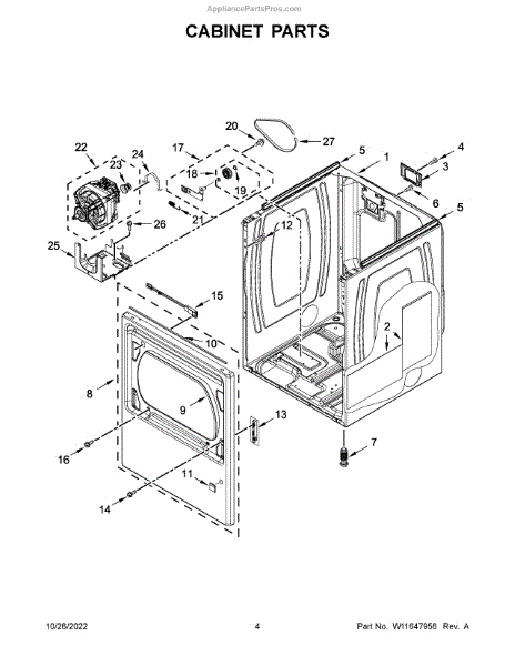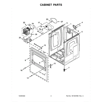 Cabinet housing for dryers. This outer shell encases internal components. Replace if cracked, rusted, dented, or structurally damaged from impact or wear.