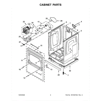 Cabinet housing for dryers. This outer shell encases internal components. Replace if cracked, rusted, dented, or structurally damaged from impact or wear.