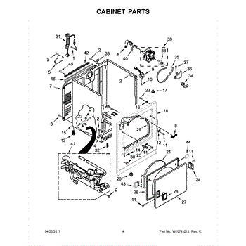 Dryer outer cabinet that houses internal components. Replace if your cabinet is rusted, dented, cracked, or damaged, compromising structural integrity.