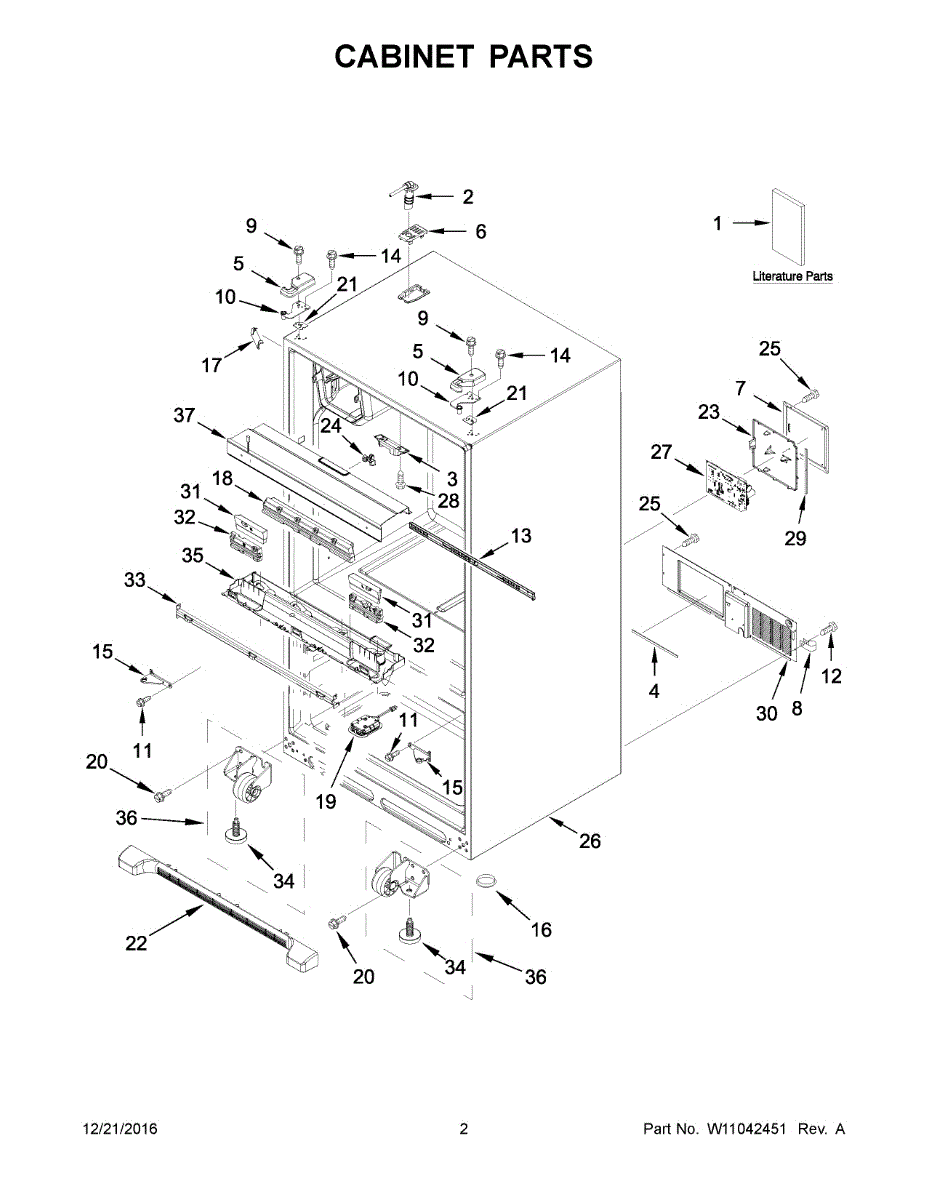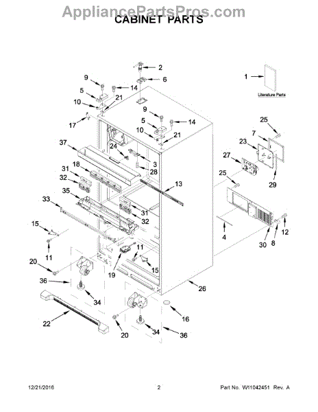 The Leveling Leg is an OEM replacement part for Whirlpool refrigerators. It is one of four legs situated internally at the base corners for proper tilt positioning. It raises or lowers each leg independently to stabilize units on uneven kitchen floors. Causes of replacement consist of wear from continual torque required during positioning processes. Thread damage or corrosion buildup attributable to floor locations over extended use necessitates periodic renewal as well. Symptoms involve: