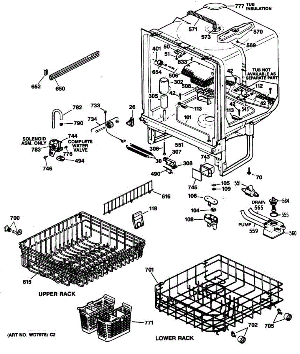 Lower dishrack assembly for dishwasher bottom level. Holds plates, pots, and pans during wash cycles. Replace if rusted, cracked, or tines broken.