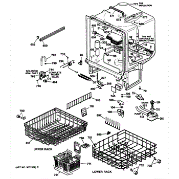 The Upper Rack is an OEM replacement part for GE dishwashers. It provides movable shelf space along the top of the dishwasher interior for washing plates, bowls, and other dishes. The shelves feature an adjustable design that accommodates various sizes and configurations of dishware. Causes of failure include normal wear and tear, accidental impacts that damage shelves or cleaning chemicals stripping away protective coatings. Symptoms of a bad upper rack can include: