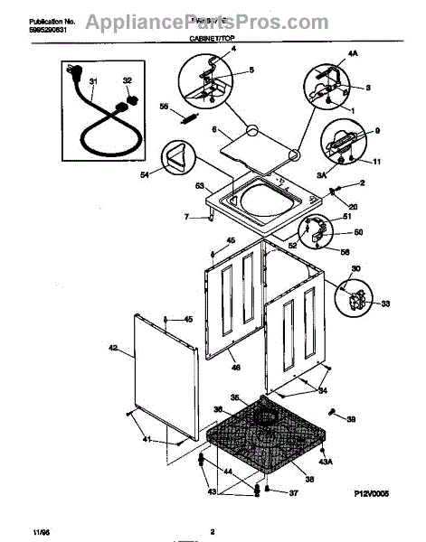 Protects the power cord where it passes through the washer cabinet. Replace if cracked, worn, or missing to prevent cord chafing and wire exposure.
