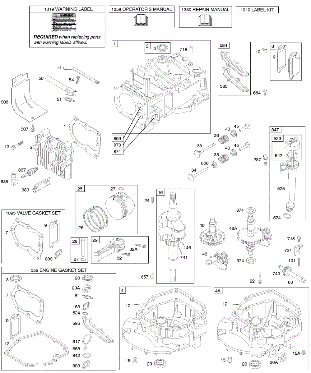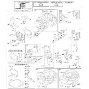 Parts for Briggs & Stratton 129702-1750-E1: Cams, Crankshaft, Cylinder, Engine Sump, Kit / Gaskets, Lubrication, Piston Group, Valves Parts