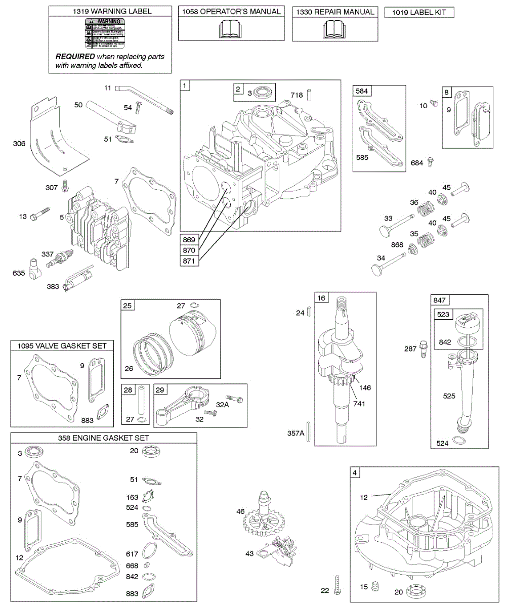 Parts for Briggs & Stratton 12J707-1750-E1: Cams, Crankshaft, Cylinder, Engine Sump, Kit / Gaskets, Lubrication, Piston Group, Valves Parts