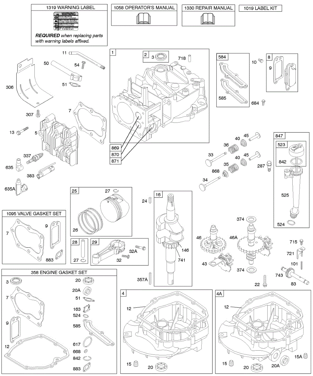 Parts for Briggs & Stratton 12J802-1122-01: Cams, Crankshaft, Cylinder, Engine Sump, Kit / Gaskets, Lubrication, Piston Group, Valves Parts